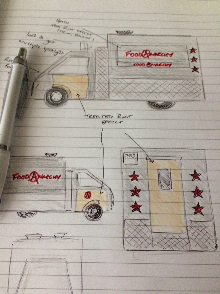 Now for the money shot, the expensive game changer, the moment it takes on a new life. The spray paint of the outside, the logo glaring, the girls little black dress number. The moment it goes from “matts munch box” to my “food Anarchy”. This will be the moment, the electrifying moment the dream hits reality. You see that will be the vision I’ve had for years, I will see her in all her glory. The inside will be good to go, the outside will finally be the vision that’s been stuck in my mind for years but one that through fear and excuses I never expanded on it being a concept. With the van ready to go it becomes a reality and vindication.